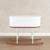 This modern bassinet features a streamlined chrome stand and solid wood rocking feet. Metal stationary stoppers on ends of the rocking feet allow you keep the bassinet securely in place while your baby sleepsWhat's Included